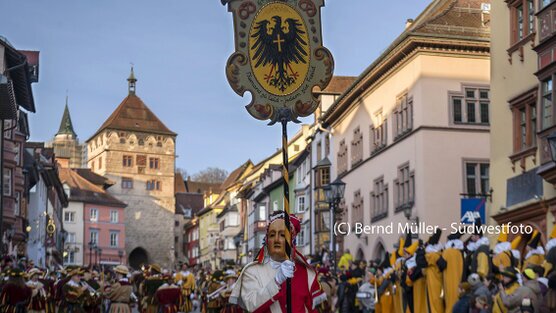 Der Narrenengel geht, in den alten Reichstadtfarben Rot und Weiß und mit der Zunfttafel, dem Narrensprung voran. Der Narrenenengel erinnert an die uralte "Engelsgesellschaft", eine Vereinigung der ledigen Bürgersöhne, welche schon im erneuerten Recht der Reichsstadt von 1546 erwähnt wird und die zur Reichsstadtzeit lange Jahre für einen geordneten Fasnetsablauf verantwortlich war.